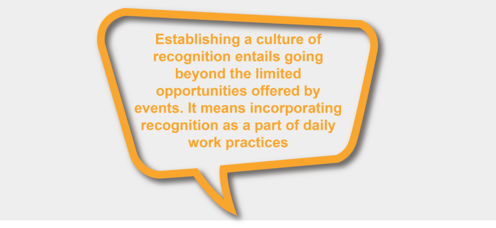 Establishing a culture of recognition entails going beyond the limited opportunities offered by events. It means incorporating recognition as a part of daily work practices. When managers and peers are all empowered and encouraged to recognize good work, the concept of recognition gets instilled in the organizational culture.