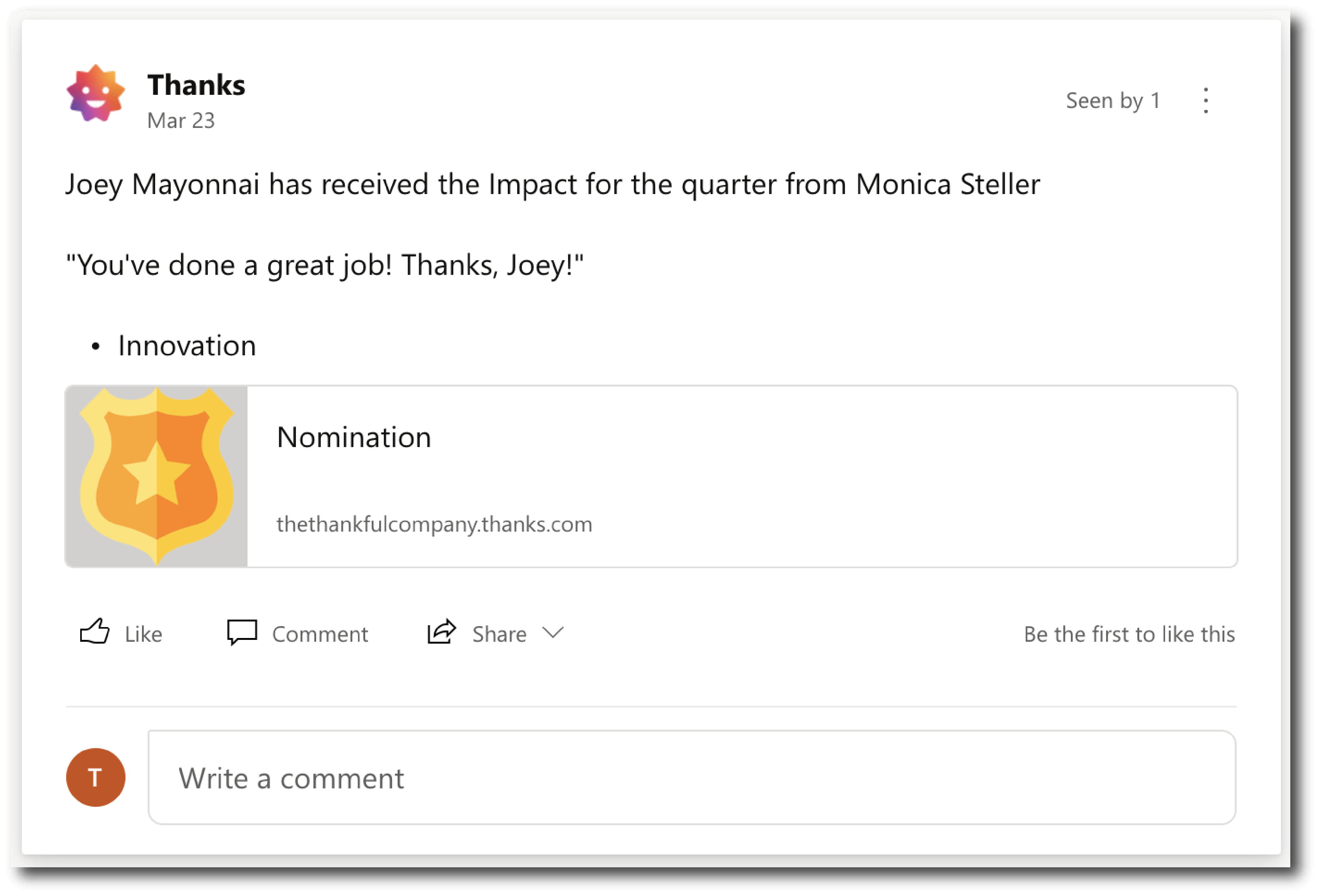Publicize recognition received within your organization to your Yammer network. View recognition received in the flow of work and see every progress across teams come together.