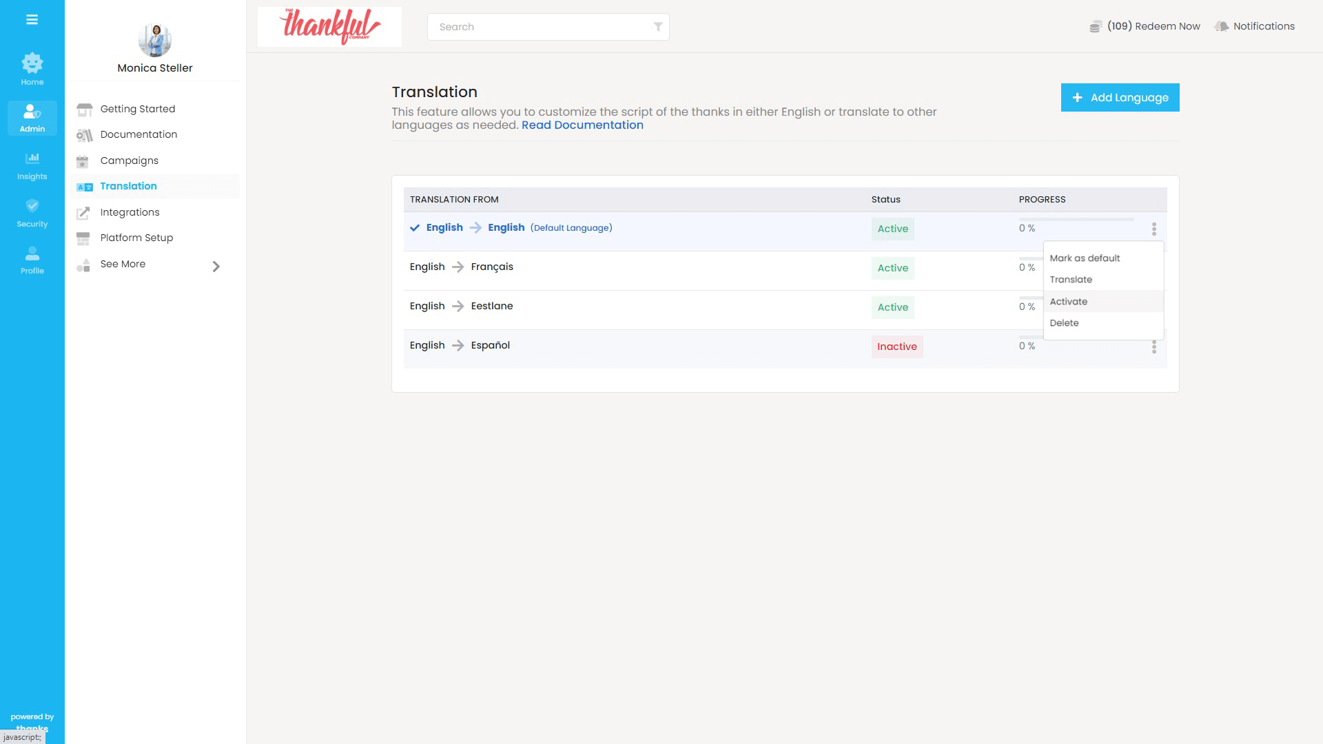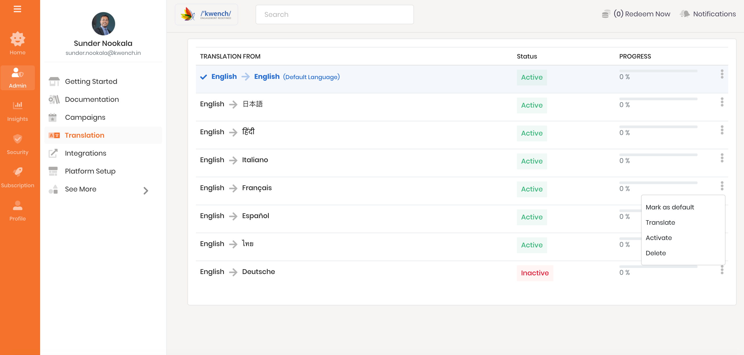 - Select Activate option. This will show translated text to all users who choose that language as their preferred language. See “How to set your preferred language?”.
