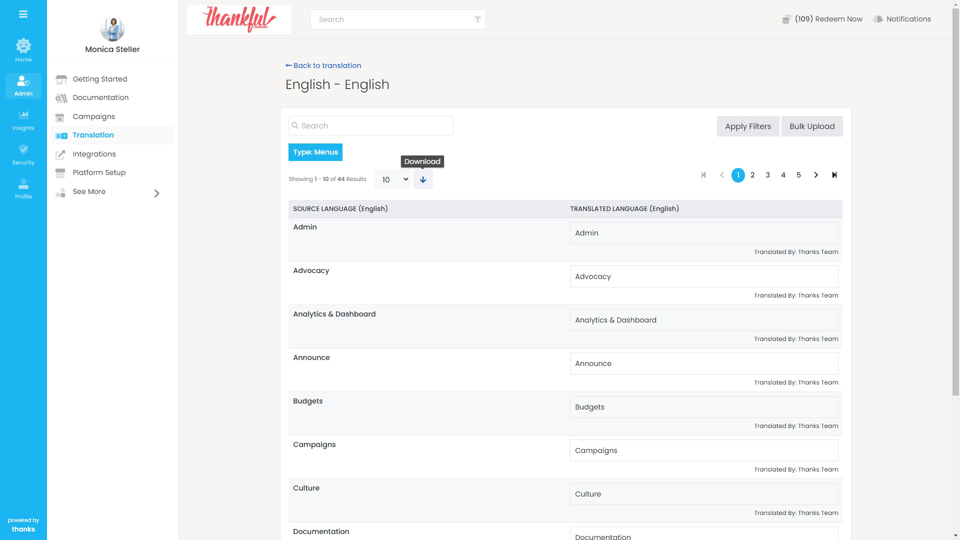 This will download all the platform verbiage into MS Excel which you can edit manually. - Click on the Bulk Upload button, select MS Excel file with your edits and click on Upload Translation button to upload your manually edited verbiage.
