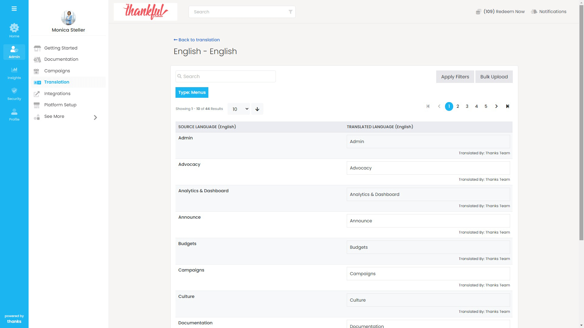 - Select Translateoption. This will show translated text of all the platform verbiage into your language.