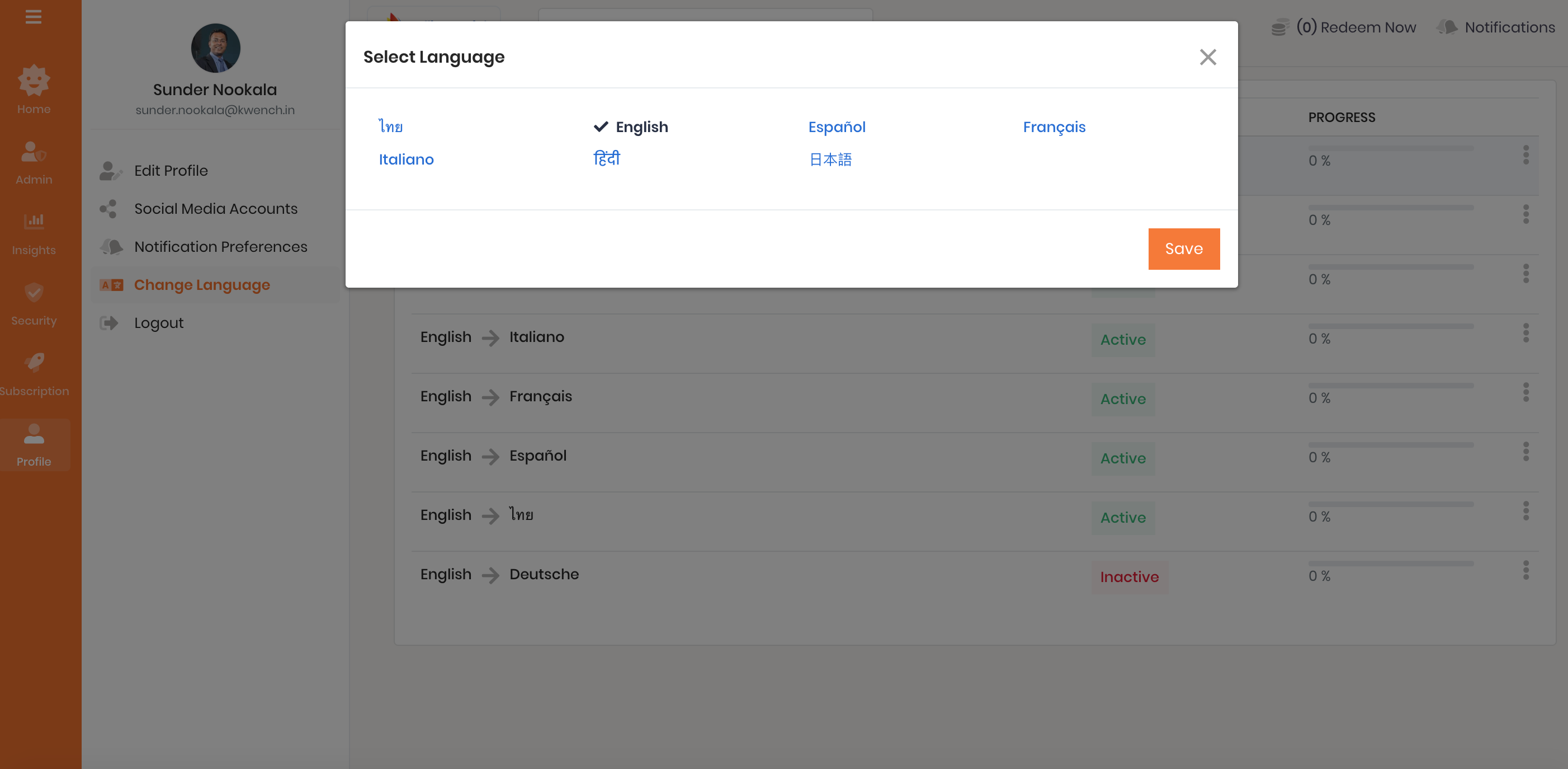 - Select Translate option. This will show translated text of all the platform verbiage into your language.