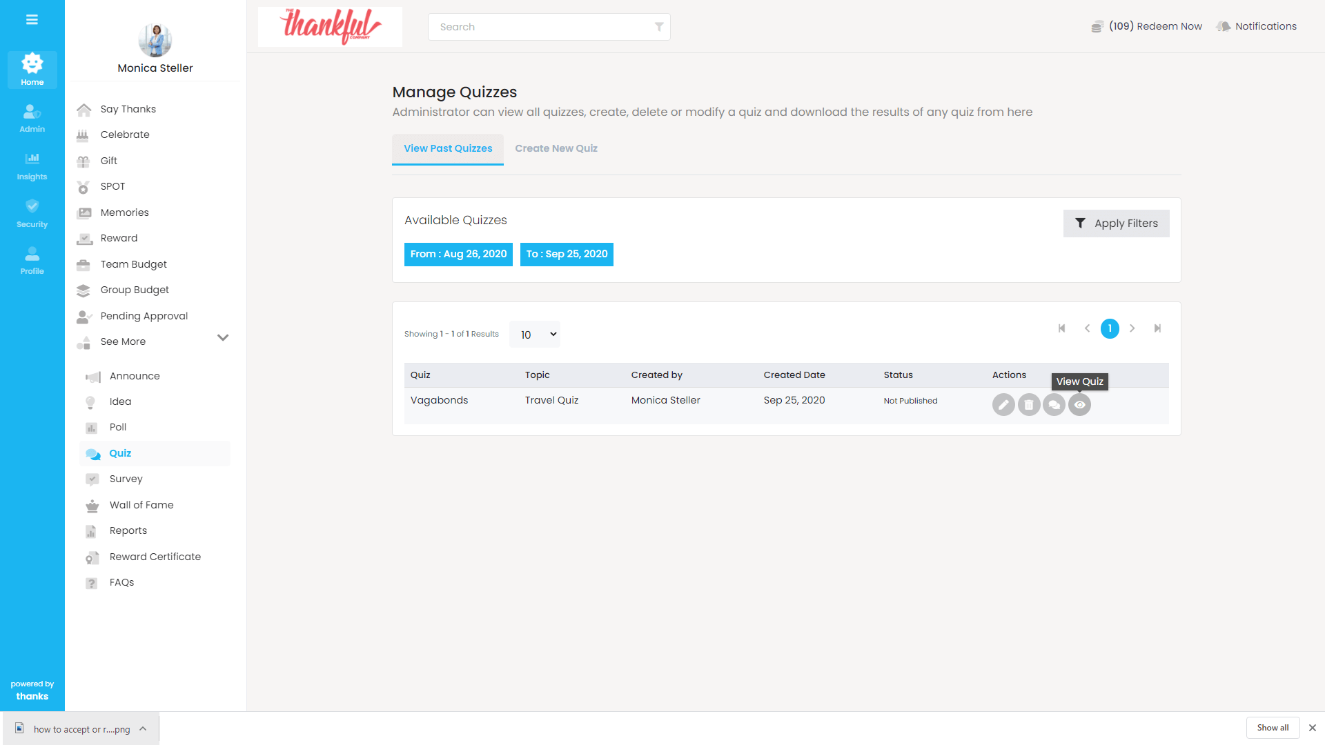 - Click on the View Past Quizzes tab. This will show the list of all quizzes along with their published or not published status.