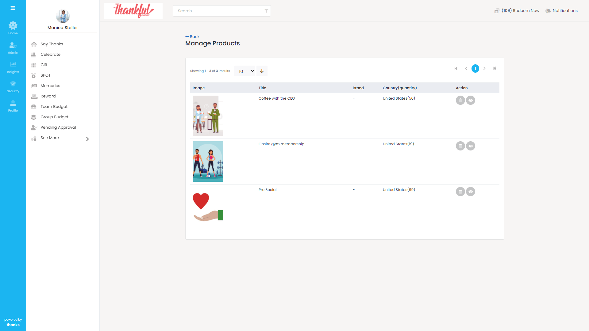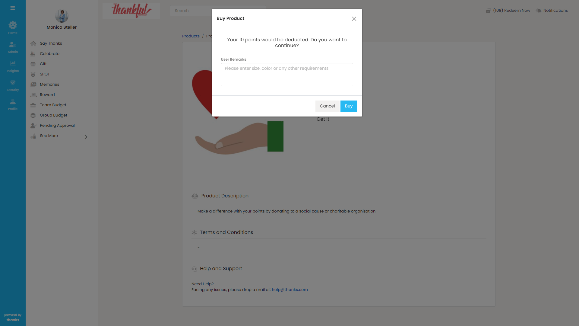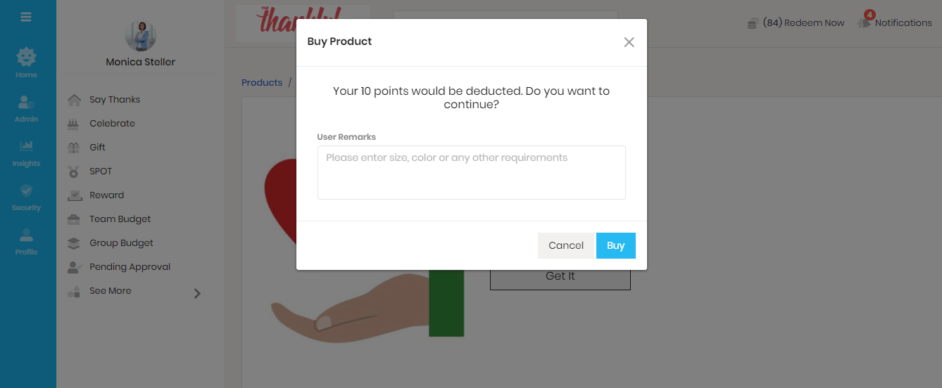 - On the top right-hand side of the page, click Redeem Now button. You will be asked to select either ‘Thanks Store’ or ‘Company Store’ (in case company store is activated by the admin)
