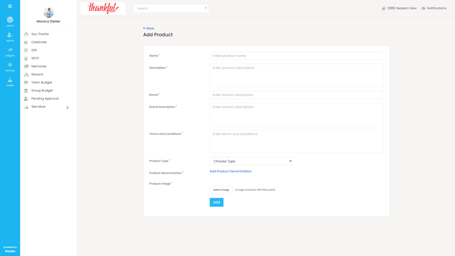 Ensure that the ‘Company Store’ feature is activated. - Go back to the homepage and click on the ‘Redeem Now’ button on the top right-hand side of the page. You will be asked to select either ‘Thanks Store’ or ‘Company Store’.