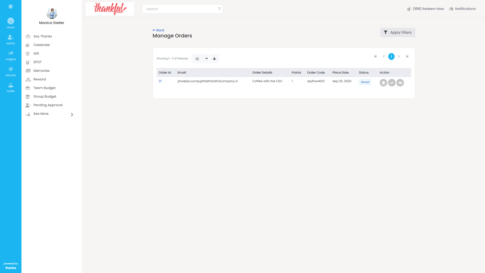 - Click on ‘Action’ and select ‘Manage Orders’ from the drop-down list.