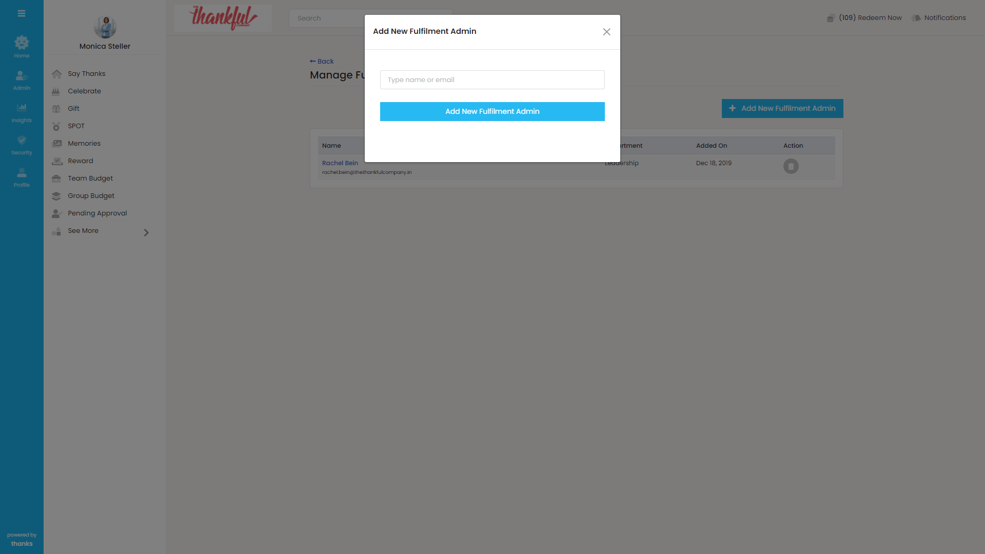 - Click on ‘Add a new fulfilment Admin’ to assign the role to a user. Type in the name or the email address of the user and hit add new button.