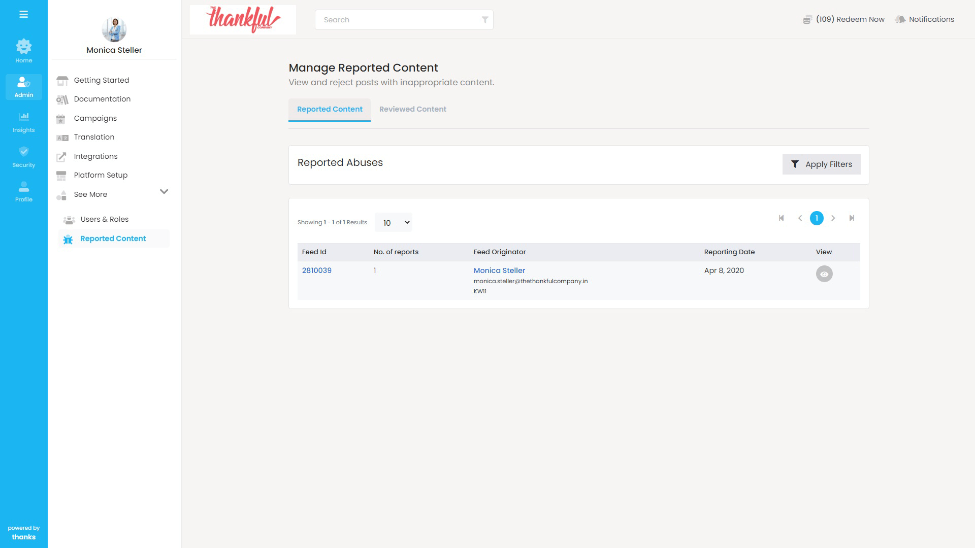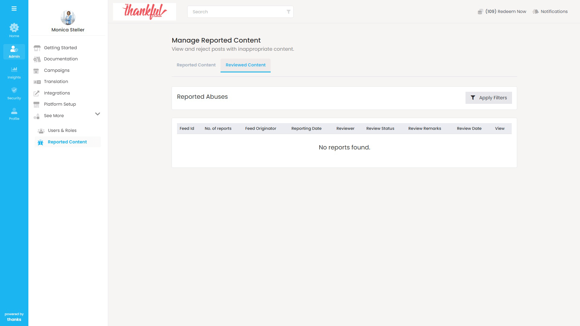 This page shows the Administrator how to manage reported feed content on the Thanks platform.